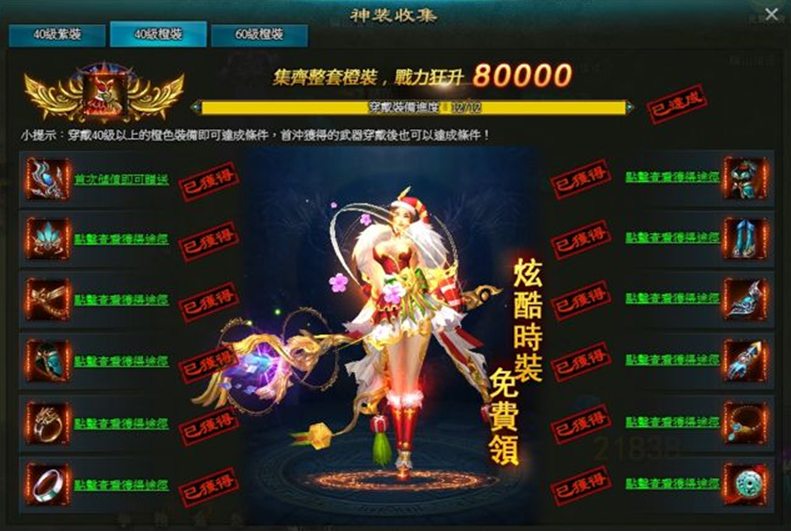 當然神裝的收集共分為 5 個部分,分別為 40 級紫裝套、40 級橙裝套、60 級橙裝套、精裝套、魔裝套。達成即可獲得總共 5 件永久精美時裝。