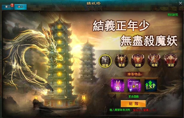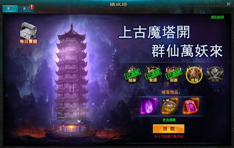鎮妖塔分為 2 大類 單人魔塔與組隊魔塔,每類分別擁有簡單、普通、困難、地獄、深淵 5 個難度。
