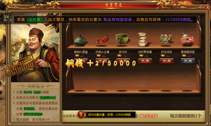 「古董商店」是最簡單獲得大量銅幣的地方,如果有足夠的元寶跟綁元,基本上選擇這裡投入就對了。因為古董商店真品的機率高達60-70%!如果被搶光了,你就只能等下一批古董!