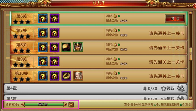 當人物達到相對應等級時將開啟武將系統,便可以開始招兵買馬,開始征戰天下的戎馬一生了。在這裡,你可以與三國各路名將熱血搏殺,然後用你的人格魅力令他們俯首稱臣。進行每場打天下需消耗6軍令,而軍令可以通過自動恢復(每5分鐘恢復1軍令)、元寶購買、封地和兌換商店獲得軍令包等多重途徑獲得。