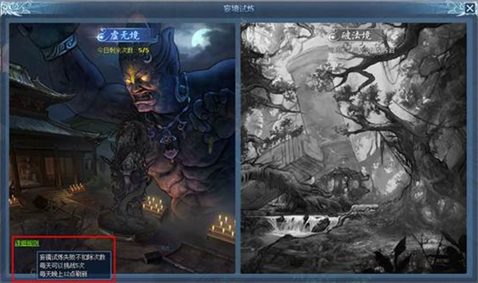 虛無境每週一、三、五、日開啟,每日可挑戰五次,副本分難度,每個等級階段都會開啟一個新難度的關卡給予挑戰。並且虛無境的怪物屬於物理免疫,建議大家挑戰使用法系古劍。