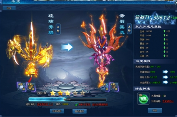 啟動法寶,可以為玩家基礎屬性增加永久加成,法寶共有十階,每一階法寶都有不同的外型,玩家可以通過消耗法寶進階道具混元玉,升階法寶,提升屬性。進階後可以提升屬性以及全新的外觀。