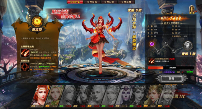 女神可以給主人增加屬性消耗女神之魂可以提升女神等級,以獲得更強大的屬性加成,女神等級達到一定級別即可開啟相應的裝備部位,可穿戴女神裝備給玩家提升大量屬性加成;女神皮膚則可以給女神帶來不同的時裝展示,還能獲得大量屬性加成。